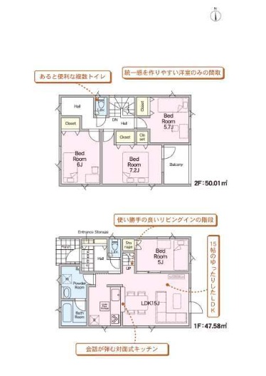 | 間取内容 | 1階LDK15畳1室 1階洋室5畳1室 2階洋室5.7畳1室 2階洋室7.2畳1室 2階洋室6畳1室 |